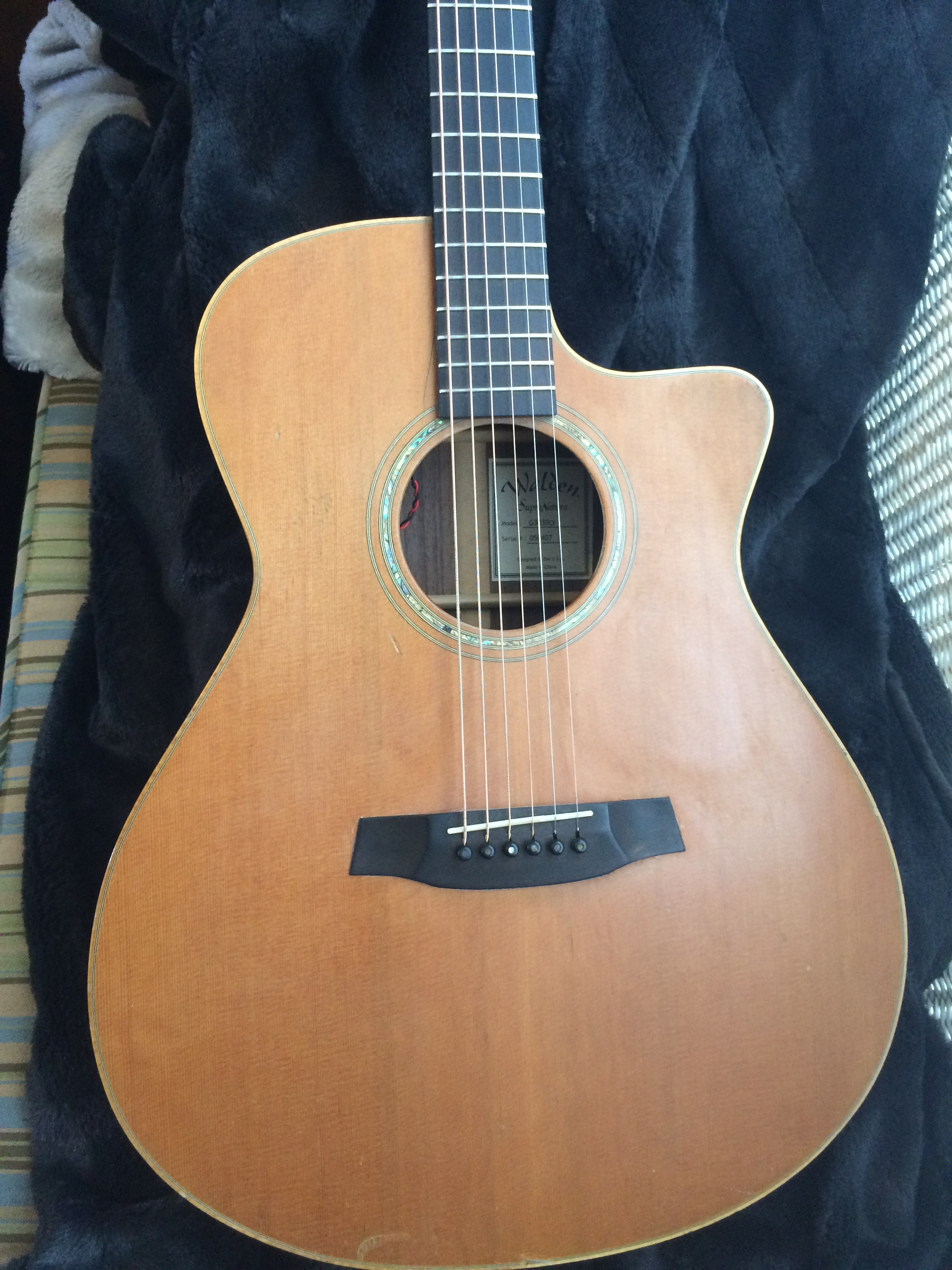 The red cedar top and Rosewood back contribute to the overall depth and clarity of this guitar in all registers. The mahogany fretboard is facile and the ebony bridge contribute to a very fine and classy guitar.
