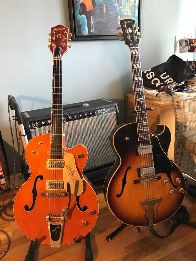 Recently, another friend posted a picture of a beautiful Gretsch 6120 “Nashville” for sale. My wife Sharon drew my attention to this post and said “You should buy it!”. I had just spent an unexpected load of money on a huge car repair, and I told her all my reasons not to buy yet another guitar. I am not a collector, I’m a player. My negativity lost, so I sent a message to my friend Victor who said he had posted it for Bill Hill. My heart leaped. I now knew it would be a quality instrument, well maintained and well played…. for a minute I considered offering him the 175 as a trade, but rejected that thought and just forged ahead. I texted Bill and said I’d like to buy the guitar. He ascertained that I was serious and immediately took his advertisements down. We made an arrangement for me to see it the day after my vaccination. I sent him an e-transfer even before I tried it.