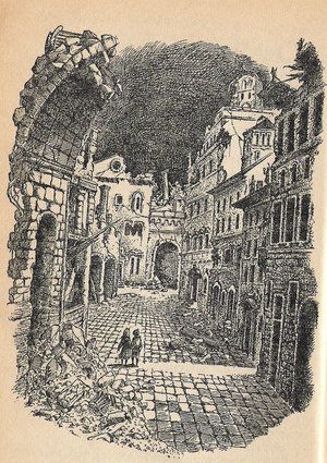 Today it was raining fairly heavily, so I drove slowly up and down more narrow avenues than I would have on foot. I was struck how, in places, the panorama looked like a petrified forest of lifeless stumps and in others like smaller versions of the structures of the long abandoned kingdom of Charn from one of the illustrations by Pauline Baynes in C.S. Lewis’ “The Magician’s Nephew”.