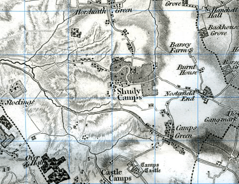 SHUDY-CAMPS, in ancient records, called Shudee-Camps, and Scode-Camps, adjoins to Castle-Camps, being 14 miles south-east of Cambridge, and about 13 south of Newmarket : it was sometimes called Parva-Camps; and appears to have acquired its present name form the family of Shudee, who, in ancient times, possessed the manor, and gave the hamlet of Northoe to the monks of Ely.