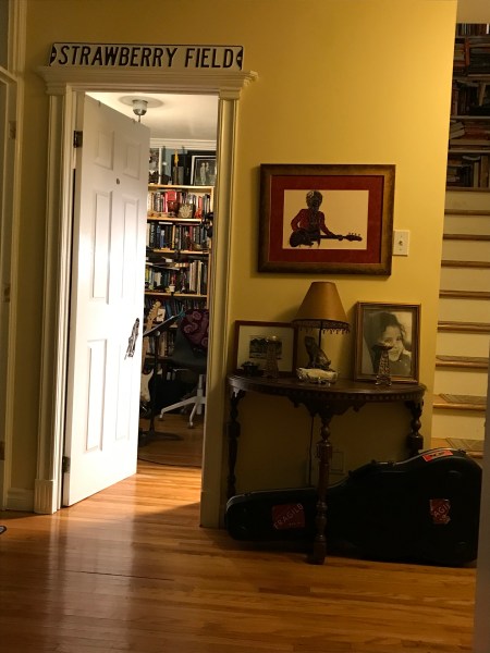 Above the door is a street sign I bought in Liverpool. Favourite song by favourite Beatle. Just down and to the right is a stylized portrait of Bob Dylan that Sharon bought for me from our artist friend Susan Shulman.